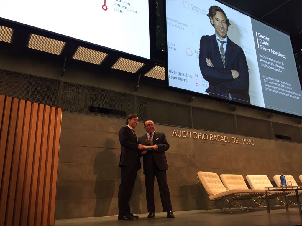 El investigador, Pablo Pérez, del grupo del CIBEROBN dirigido por José López Miranda, ha sido reconocido, el pasado miércoles 23 de mayo, con el I Premio a la Investigación Fundación Jesús Serra. Recibió el premio, de mano del presidente de dicha Fundación, Federico Halpern, y de la Secretaria de Estado de Investigación, Desarrollo e Innovación, Carmen Vela, en una gala celebrada en el Auditorio Rafael del Pino, en Madrid.