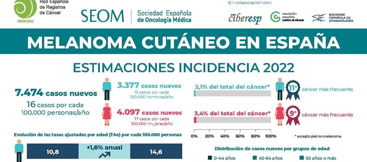 La incidencia de melanoma cutáneo en España está aumentando. Entre 2002 y 2022, la tasa de incidencia anual ajustada por edad por cada 100.000 personas se ha incrementado tanto en hombres como en mujeres. En concreto, ha pasado de 10,5 a 16,3 casos en mujeres y de 10,8 a 14,6 en hombres, lo que supone un incremento anual del 2,5% y del 1,6% respectivamente, según refleja la infografía sobre “Melanoma cutáneo en España” elaborada, coincidiendo con la época estival, por la Red Española de Registros de Cáncer (REDECAN) y la Sociedad Española de Oncología Médica (SEOM) y que ha contado con la colaboración del CIBERESP.